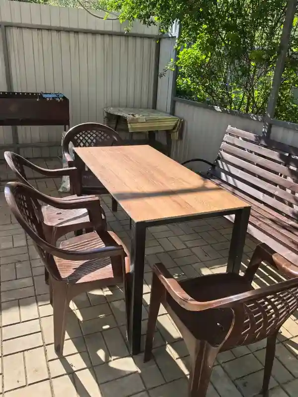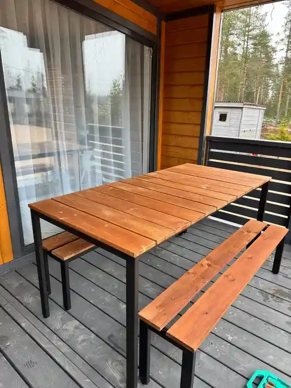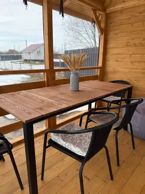 Компактный стол для небольшой террасы — то что надо. Дерево тёплое, приятное на ощупь. Раз в сезон обрабатываем маслом — и стол как новый. Все соседи завидуют!