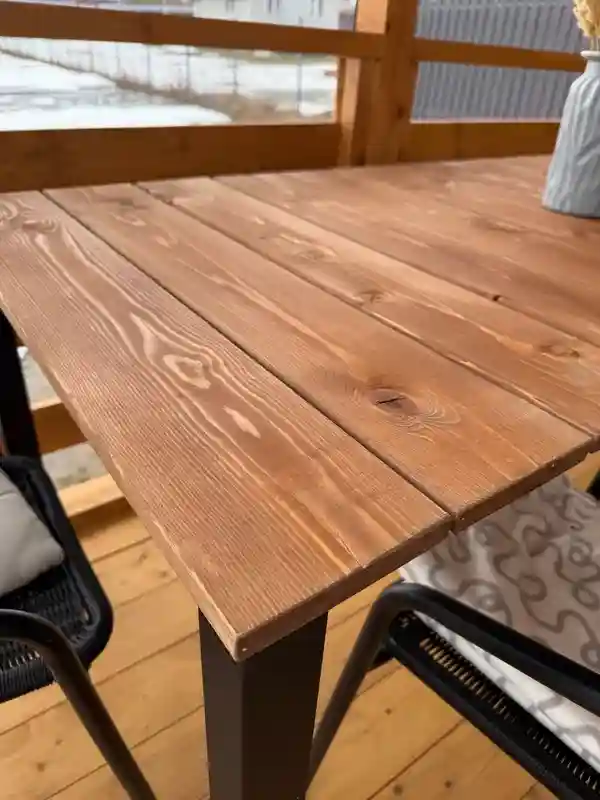 Компактный стол для небольшой террасы — то что надо. Дерево тёплое, приятное на ощупь. Раз в сезон обрабатываем маслом — и стол как новый. Все соседи завидуют!